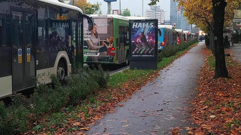Kot kaže naša fotografija, so avtobusi mestnega prometa na Dunajski cesti nasproti Gospodarskega razstavišča v smeri proti centru obtičali v nepregledni koloni, in to kljub policistoma v križišču. Bralci so nas obvestili, da se je precej voznikov, ki se peljejo mimo bežigrajskega stadiona, odločilo uporabiti rumeni vozni pas, kar je seveda prepovedano.