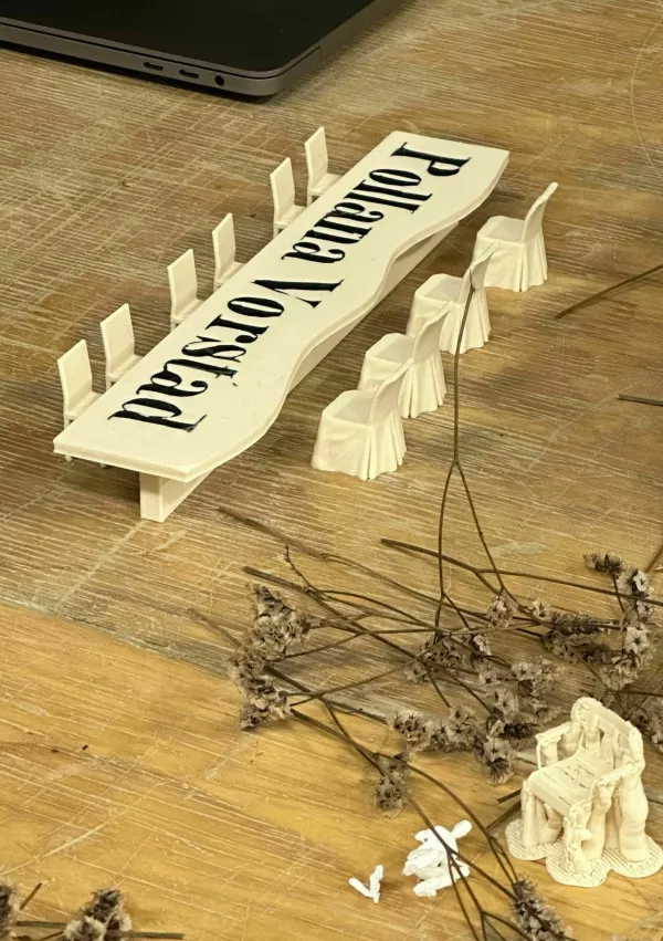 Na površini mize ustvarjalca predlagata napis Pollana Vorstadt, navajata pa tudi različico v slovenskem jeziku – Mestna pristava. Napis sloni na reprodukciji napisov na sto let starem zemljevidu Cirila Metoda Kocha in še enem nekoliko starejšem, ki navajata zgodovinski imeni tega območja, kjer bo v prihodnje stala nova soseska. Z zapisom Poljansko predmestje v nemščini in Mestna pristava se avtorja obračata k večplastni zgodovini tako mikrolokacije kot širše Ljubljane. Na tak način v prostor soseske vnašata še eno od njenih identifikacijskih točk.