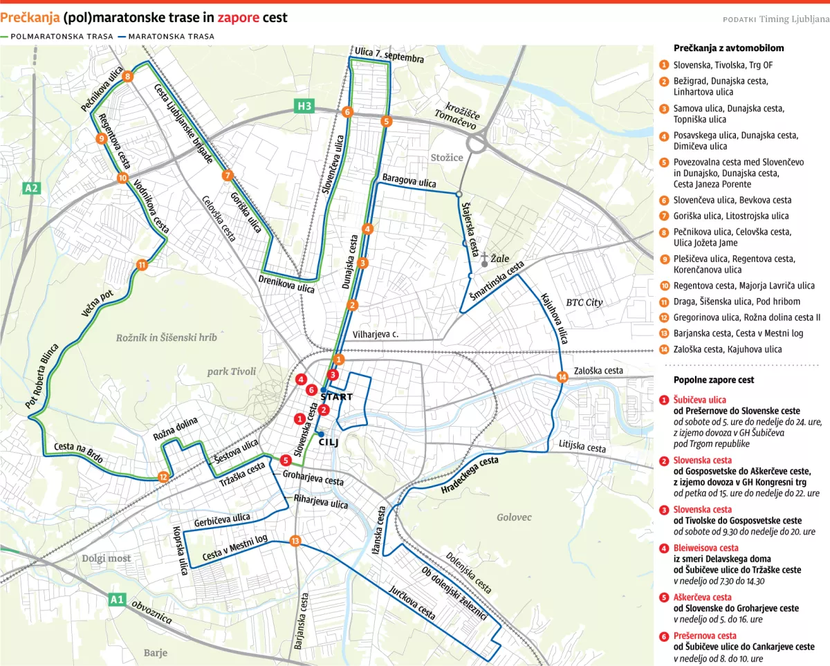 Prečkanje trase je v skladu s potekom maratona predvideno v križiščih Slovenska-Tivolska-Trg OF, Bežigrad-Dunajska-Linhartova, Samova-Dunajska-Topniška, Posavskega ulica-Dunajska-Dimičeva, povezovalna cesta med Slovenčevo in Dunajsko-Dunajska-Cesta Janeza Porente, Slovenčeva-Bevkova, Goriška-Litostrojska, Pečnikova-Celovška-Ulica Jožeta Jame, Plešičeva-Regentova-Korenčanova, Regentova-Majorja Lavriča ulica, Draga-Šišenska-Pod hribom, Gregorinova-Rožna dolina cesta II, Barjanska-Cesta v Mestni log, Zaloška-Kajuhova.