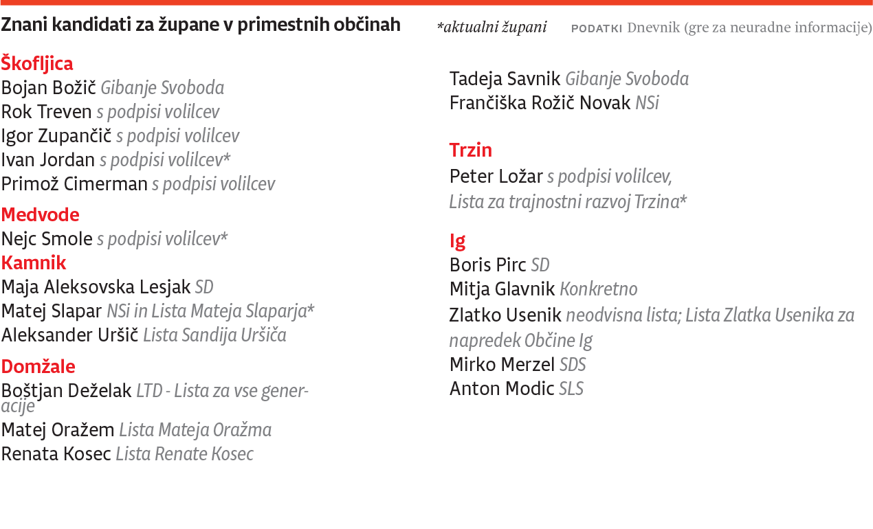 Pred prvim krogom lokalnih volitev, ki bodo potekale 20. novembra, smo sestavili tudi seznam kandidatur za župane v občinah okoli Ljubljane. Kandidature bodo uradne najpozneje 30. oktobra, to je po potrditvi v občinskih volilnih komisijah. Po naših informacijah bodo imeli volilci največ izbire na Igu ter v Škofljici in Domžalah, kjer se bo za županski stolček potegovalo pet imen.