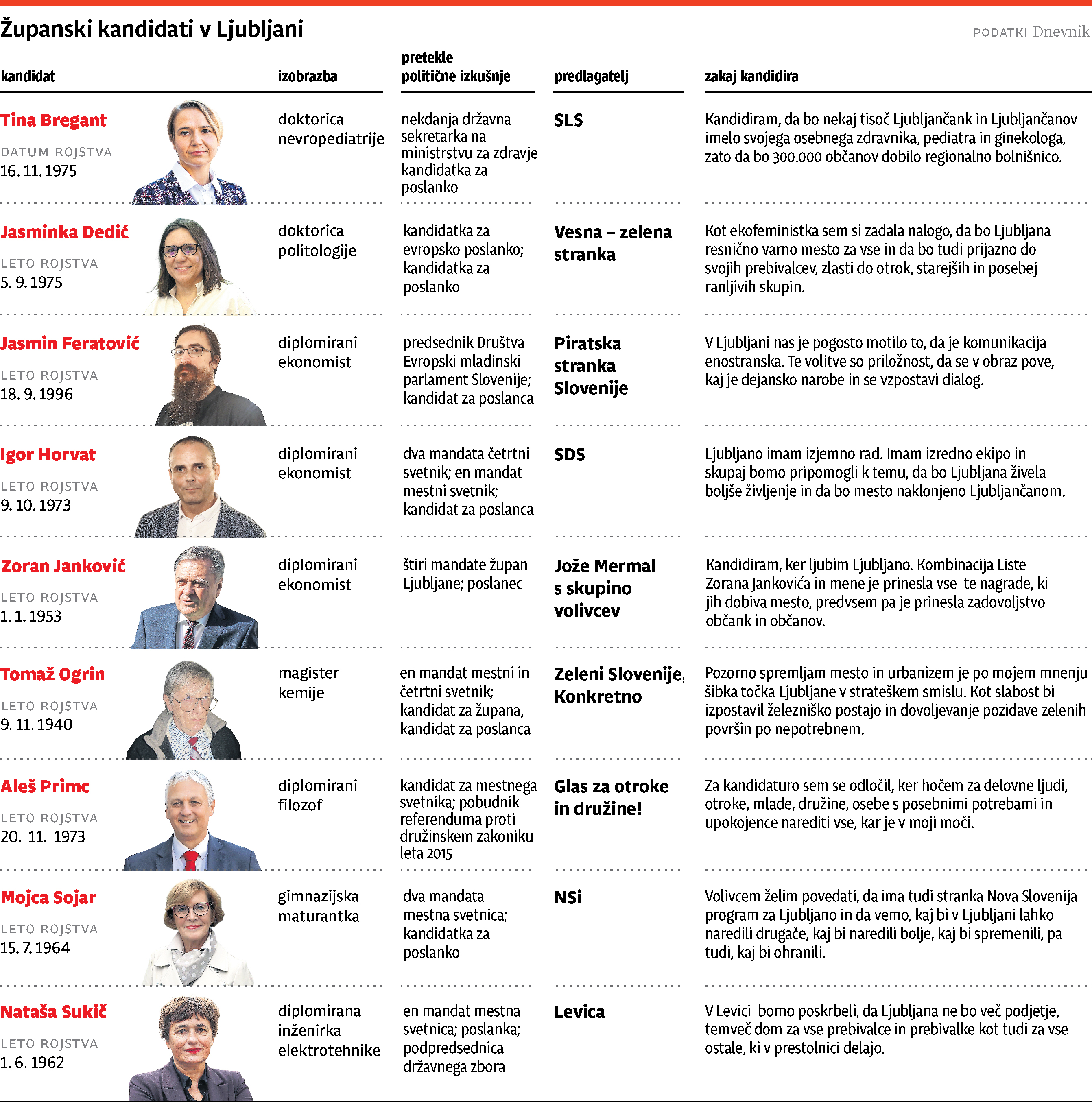 Do zadnjega roka za oddajo kandidature za novembrske lokalne volitve se je v Ljubljani javilo devet kandidatk in kandidatov, ki si želijo nadeti župansko verigo. Poleg trenutnega župana Zorana Jankovića, ki ima za seboj že šestnajst let županovanja, si na čelo mestne hiše prizadevajo priti še Tina Bregant, Jasminka Dedić, Jasmin Feratović, Igor Horvat, Tomaž Ogrin, Aleš Primc, Mojca Sojar in Nataša Sukič. Kandidatura Ogrina, ki se je že leta 2018 pomeril z Jankovićem in s skoraj 1,5 odstotka glasov dosegel peto mesto, je bila vložena zadnja, šele včeraj popoldne. Občinska volilna komisija bo najpozneje 4. novembra objavila seznam potrjenih kandidatur in razvrstitev kandidatov na volilnem lističu.