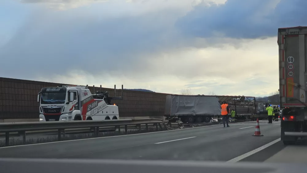 Včeraj, okoli 17. ure, se je na primorski avtocesti med Vrhniko in Brezovico, pred Logom, zgodila prometna nesreča, v kateri je bil samoudeležen tovornjak, ki ni vozil po sredini prometnega pasu. Zapeljal je s ceste in trčil v sredinsko varovalno ograjo, ki jo je prebilo, vozilo pa je nato zagorelo.