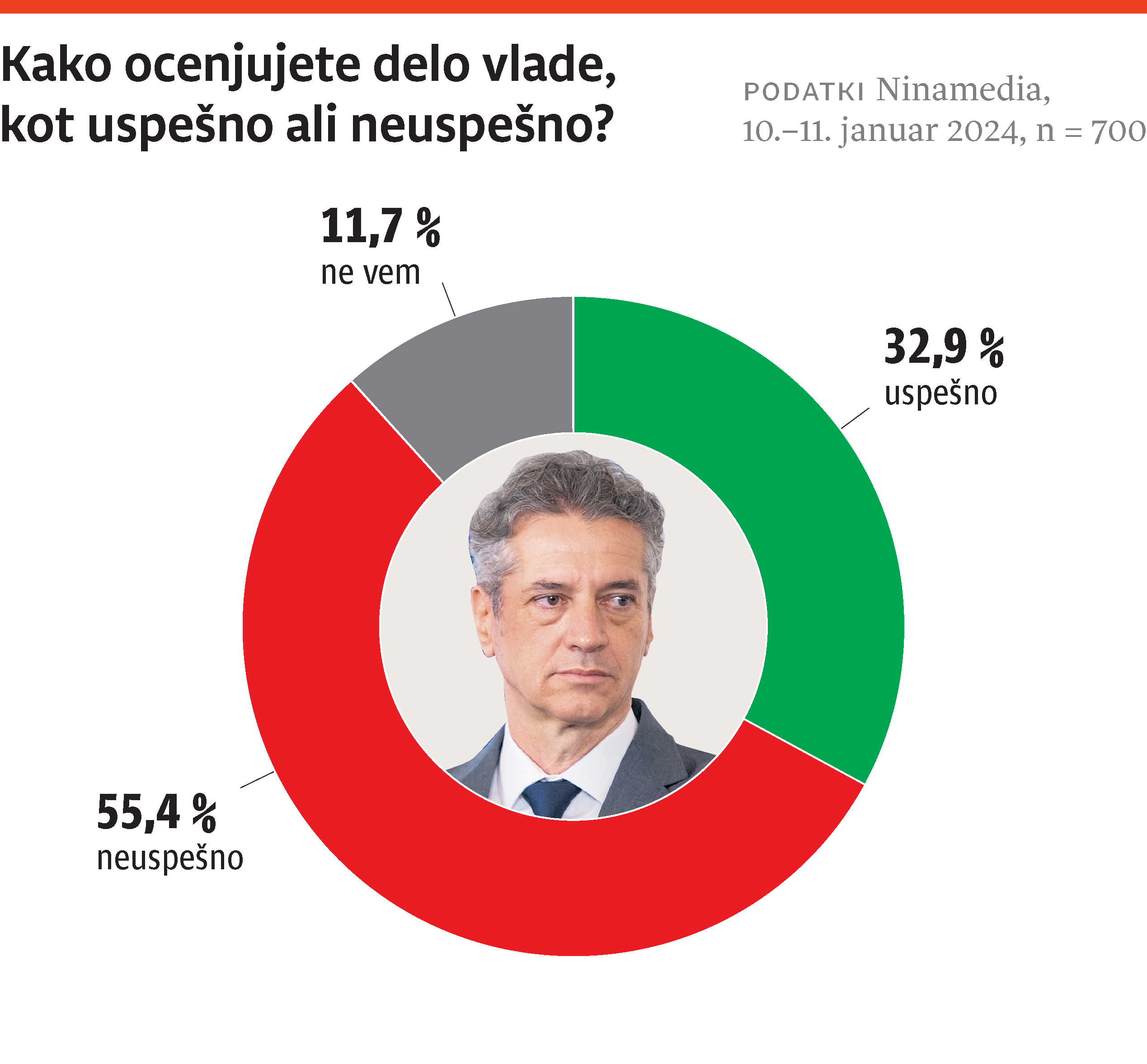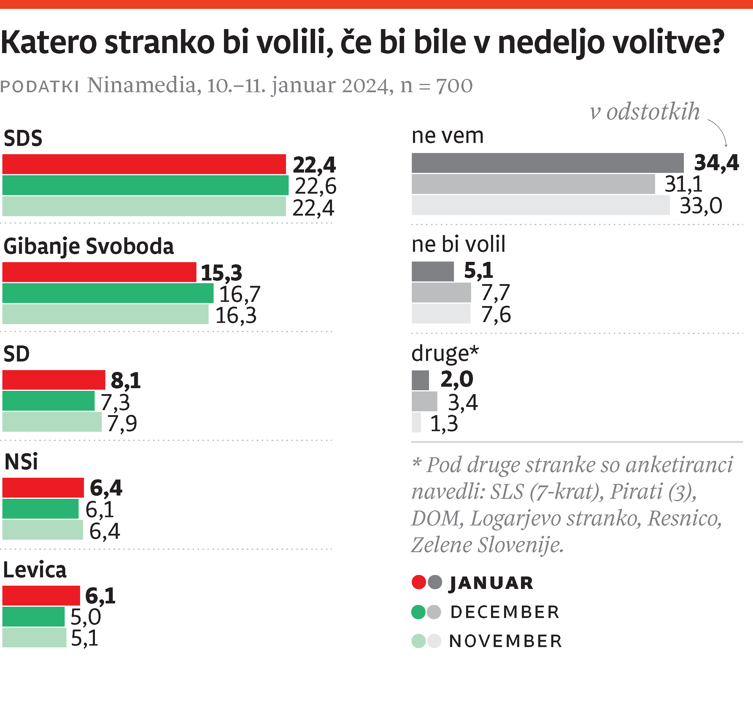 Zaznava o uspešnosti dela vlade pomembno določa volilno izbiro ljudi. Gibanje Svoboda, ki je vodilna vladna stranka, je v primerjavi z decembrom izgubilo eno odstotno točko podpore, njen 15,3-odstotni anketni rezultat pa dopušča sklepanje, da bi na volitvah, če bi bile danes, zbralo okoli 25 odstotkov glasov (opredeljeni volilci). Vodilna opozicijska stranka in sploh vodilna politična stranka ostaja SDS – volilna podpora tej stranki se zadnje tri mesece vrti okoli 22 odstotkov, kar v strukturi opredeljenih volilcev pomeni 37-odstotni delež. SDS je mejo 30 odstotkov opredeljenih glasov prvič prestopila marca lani, ko je imela za sabo 34-odstotni delež opredeljenih volilcev, GS pa 37-odstotnega. Od takrat do danes se SDS pod mejo 30 odstotkov ni več spustila, GS pa je zdrsnila na današnjih 25 odstotkov opredeljenih. Deleži preostalih parlamentarnih strank se v tej strukturi niso dramatično spreminjali, zato pa se je od lanske pomladi naprej začel zviševati delež neopredeljenih: od marca 2023 do januarja 2024 je neopredeljenih po podatkih Ninamedie več za 32 odstotkov, od lanskega januarja do letošnjega januarja pa za kar 83 odstotkov! Z naraščanjem števila neopredeljenih je mogoče pojasniti, zakaj se je v strukturi opredeljenih volilcev SDS tako zelo okrepila, podatek, da med neopredeljenimi prevladujejo tisti, ki ocenjujejo, da je vlada neuspešna, pa pojasnjuje stagnacijo ratingov preostalih dveh vladnih strank in opozarja na volilni potencial opozicije (in oziroma ali kakšnih novih kandidatnih list, če bi volilce med volilno kampanjo spet snubili kakšni »novi obrazi«). Novi glasovi so med volilnimi upravičenci, ki ne vedo, kako bi glasovali. Trenutno razpoloženje med opredeljenimi volilci je tako, da bi stranke sedanje vladne koalicije težko segle čez parlamentarno večino.