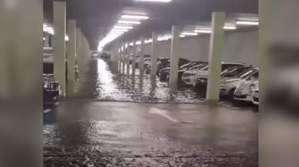 Portal Neurje.si piše, da je v Velenju v pičli uri padlo kar 50 mm padavin. Na spodnjem posnetku je vidna garaža trgovine Spar v centru mesta.