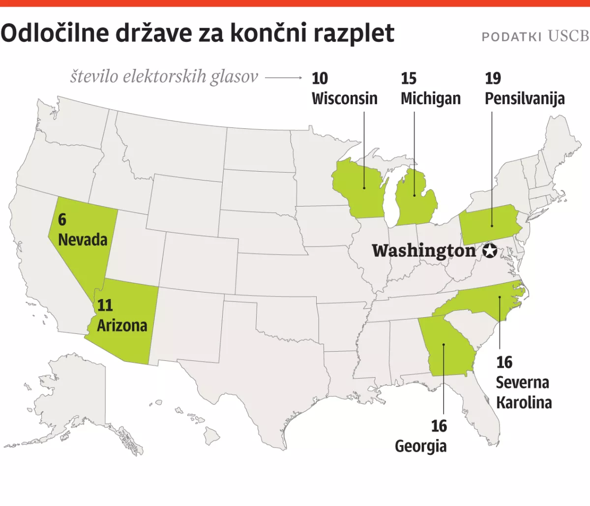 Predsedniške volitve v ZDA so že nekaj časa osredotočene na samo sedem od petdesetih zveznih držav. Te sicer same po sebi niso nič pomembnejše od preostalih 43, se pa od njih bistveno razlikujejo: vse ankete kažejo, da imata tam možnost za zmago tako Donald Trump kot Kamala Harris, tako da bo šele razplet v sedmerici dal odgovor na vprašanje, kdo bo ZDA vodil naslednja štiri leta. Harrisova ima že zagotovljenih 226 elektorskih glasov, Trump 219 (ker se ve, v katerih od 43 zveznih držav bo kdo zmagal). Za zmago jih je potrebnih 270. Ključno bo, kdo bo zmagal kje v sedmih neodločenih državah, ki imajo skupno 93 elektorjev.