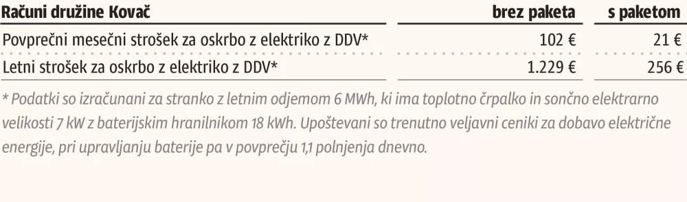 Družina Kovač živi v nizkoenergijski hiši in letno porabi približno 6.000 kWh elektrike, pri čemer za ogrevanje uporabljajo toplotno črpalko. Pred odločitvijo za paket Pametna samooskrba so za elektriko plačevali 1.229 € na leto. Danes, zahvaljujoč lastni sončni elektrarni in naprednemu upravljanju baterijskega hranilnika, znaša njihov letni strošek le še 256 € – to pomeni kar973 € letnega prihranka oziroma 79 % nižji strošek za elektriko.