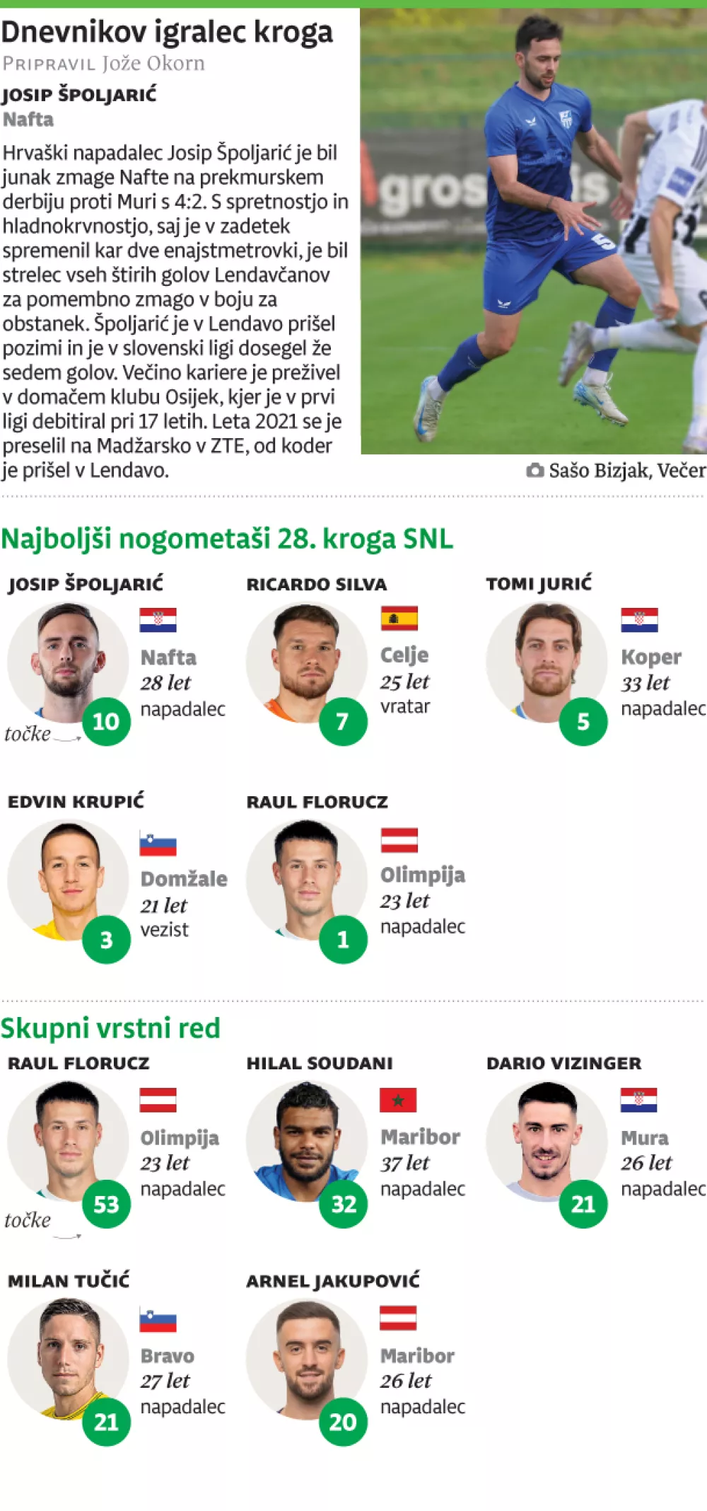 Izidi 28. kroga v 1. SNL: Nafta - Mura 4:2 (1:1, Špoljarić 31, 53/11 m, 72/11 m, 101; Vizinger 40, Proleta 99), Koper – Radomlje 3:1 (1:0, T. Jurić 43/11 m, 86, Logonda 76; Martinčić 72), Primorje – Olimpija 0:2 (0:1, Silva 32, Brest 52), Bravo – Celje 1:2 (Baboula 25; Matko 32, 38), Domžale – Maribor 1:0 (0:0, Perc 69). Pari 29. kroga, torek ob 18. uri: Radomlje – Nafta, sreda ob 17. uri: Olimpija – Koper, četrtek ob 16. uri: Primorje – Bravo, ob 18.15: Mura – Domžale, preloženo Maribor – Celje.