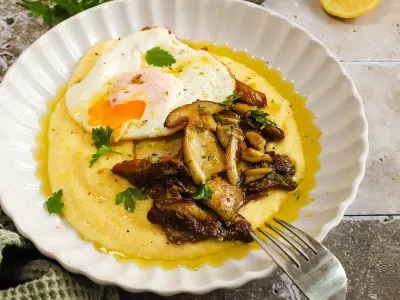 Recept: Mascarpone polenta s pečenimi gobicami in jajcem