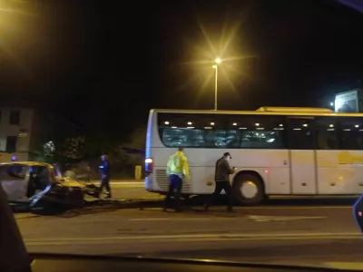 Avtobus z otroki zapeljal na nasprotni pas in trčil v viličarja
