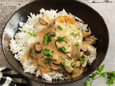 Piščančji file v stroganov omaki na rižu
