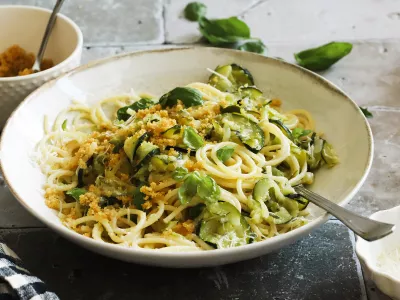 Špageti v bučkini omaki z zlatimi drobtinami