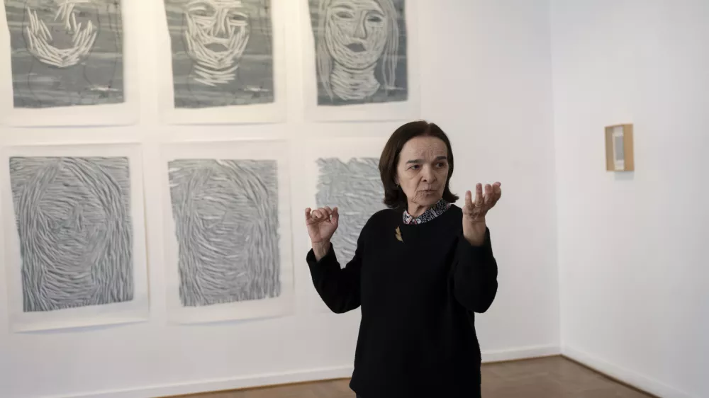 Na razstavi najdemo izbor njenih ključnih serij Linozrezki,Prostor v navdih