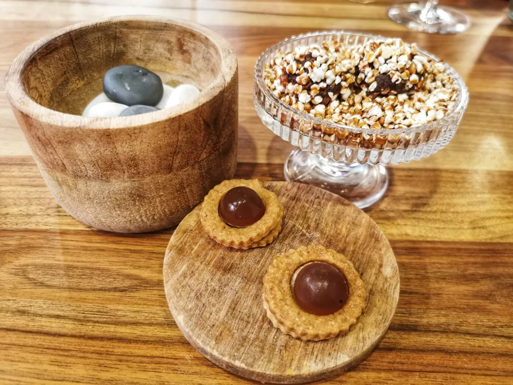 Sladice se zgodijo v treh delih, ob dišečem Steyerjevem tramincu se v predsladici predstavi sladoled iz misa bučnih semen, sledi pa storž iz pšeničnega zdroba z lešnikovo karamelo in beljakovo peno s smrekovimi vršički. Za Fickovim zeliščnim likerjem in džintonikom s hišnim džinom pa se zgodijo še bomboni iz črne čokolade v ajdovi pokovki, lincerji z želejem iz kavne kombuče in »kamni«, polnjeni z jurko.