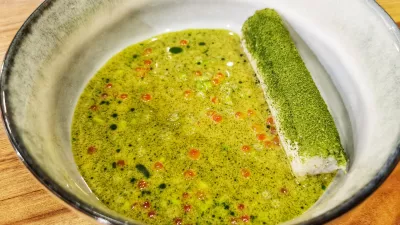 Med tople klasike gre tudi že kar konkreten file postrvi, povaljan v prahu iz peteršilja, v holandski omaki s peteršiljevim oljem, ikrami in medom, ki daje jedi nepričakovan priokus.