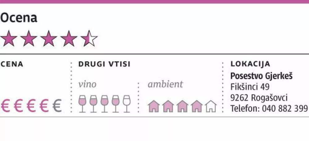 V Fikšincih na Goričkem, kakšnih 25 kilometrov od Murske Sobote, na teritoriju, ki po zemljevidu globoko zareže v avstrijsko vulkansko deželo, družina Gjerkeš vsako leto pridela okoli 15.000 steklenic vina. Za rdeča še nimajo vseh pogojev, pri belih so ponosni na svoje imenitne penine in na chardonnay Woodstock, ki zori, jasno, v dišečih lesenih sodih. Pred časom so vinsko klet krepko in lično preuredili ter v velikih prostorih ob sedmih sobah za goste postavili tudi restavracijo.