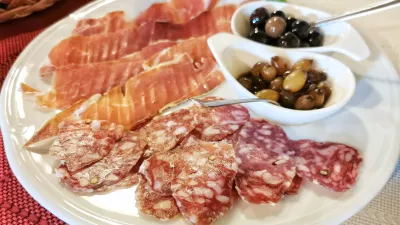 Pri San Mauru na žalost ni jedilnih listov ali vinske karte. In ker niti ne gre za poceni konobo, je bolje prej vprašati, koliko kaj stane, če vam seveda ni nerodno. Istrski pršut stane znatnih 15 evrov, je pa treba priznati, da ga narežejo na debele rezine in da je sijajnega, ravno prav sladkega okusa. V kombinaciji smo za 19 evrov naročili še porcijo boškarinove salame in boškarinovega karpača, zraven gredo še olive in okisane čebulice v že omenjenem balcanicu, kisu, ki spominja, kakopak, na balzamiko. Škoda, da kruh (dva evra) ni ravno svež, kar skušajo skriti tako, da ga popečejo.