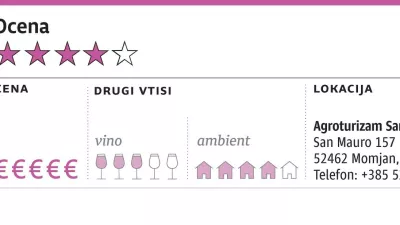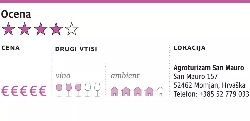 Nazadnje smo bili pri San Mauru nad Momjanom pred več kot desetimi leti. Od tistih časov so stare lastnike zamenjali ambicioznejši potomci, ki imajo zdaj pod jedilnicami orjaško vinsko klet, še več kot vina pridelajo raznih žganic, likerjev, sladkega vermuta in kisa s šaljivim imenom aceto balcanico. Vse našteto je seveda mogoče tudi kupiti za domov, pollitrski kis stane recimo devet evrov. Dostopno.