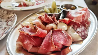 Pozdrave iz kuhinje je tvorila tudi deska z zelo mesnato slanino, guancialejem, ki ga proizvaja mojster iz kuhinje, čvrsto jelenovo salamo blejskega soseda in italijansko soppressato. Pa še kumarice, olive in popečeni kruh s soljo. Uvod, kakršnega ne pomnimo, pa smo prišli samo na čevapčiče.