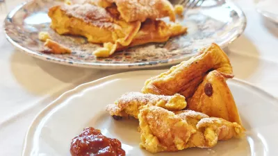 Prišli smo namreč tudi na cesarski praženec, po naše šmorn, v Unionu pa carski praženec. Spomnimo se ga še iz blejskega golf kluba in je resnično poseben, niti malo ni podoben palačinki, ampak je kot omleta, skorajda biskvit z rozinami.